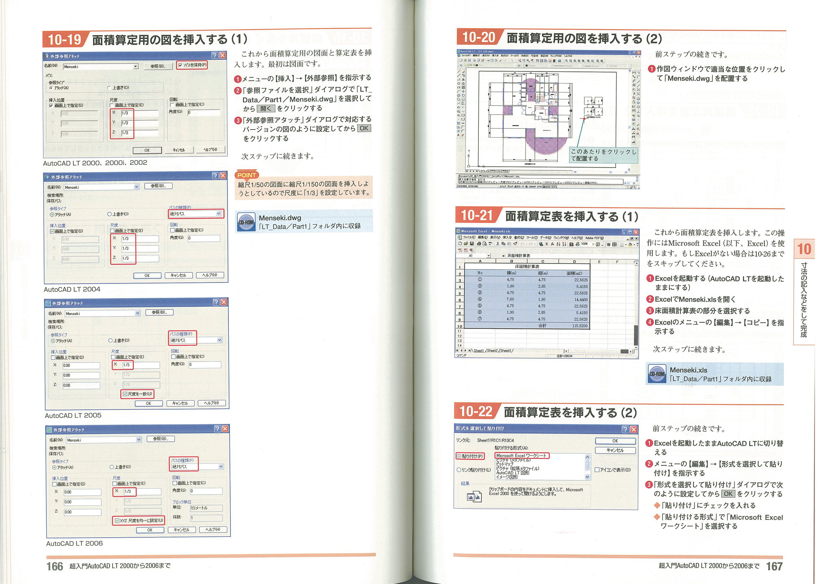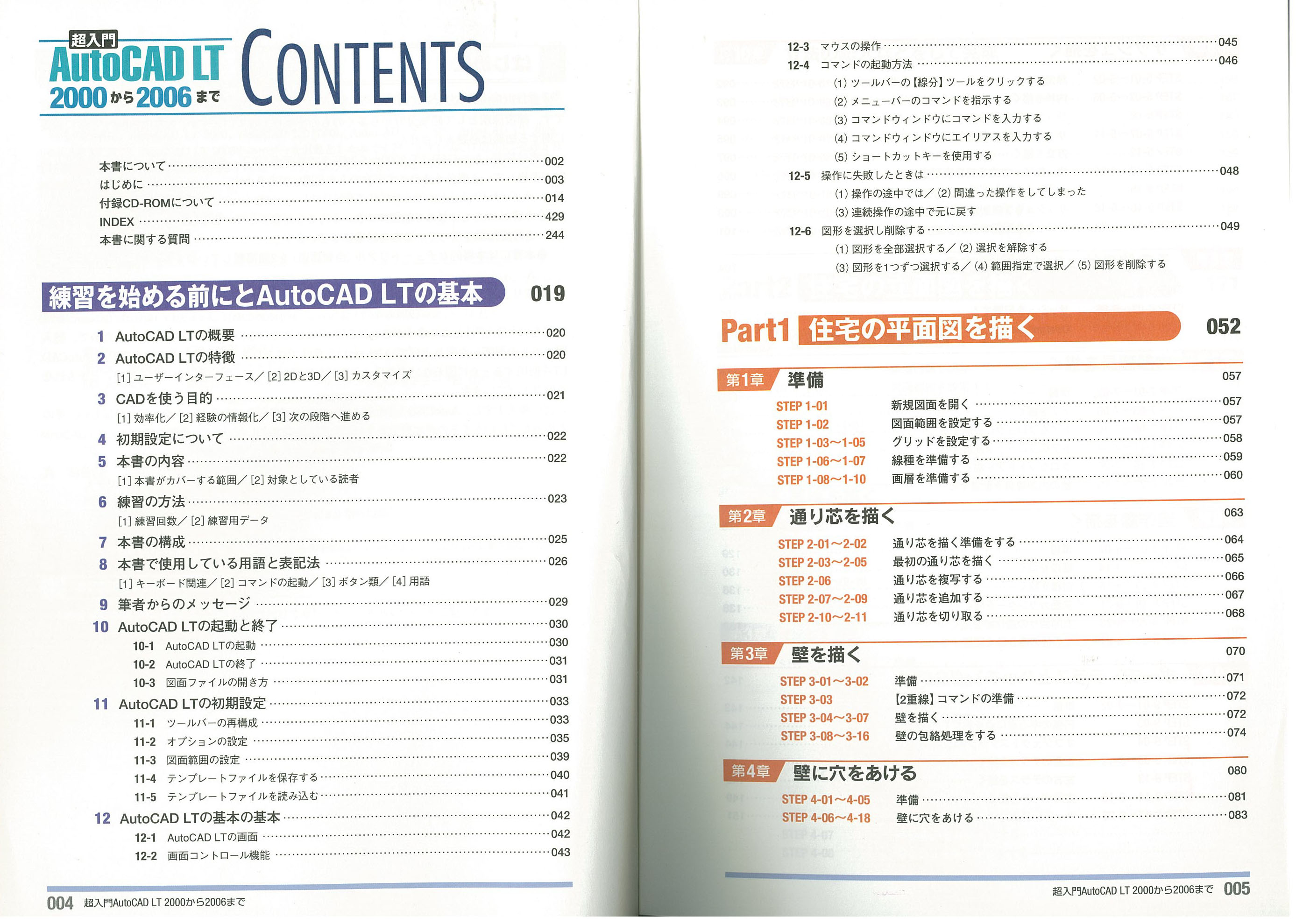 AutoCAD LT2000から2006まで、すべてのバージョンで活用できる解説書。作図から印刷まで、平面図・立体図を作図しながら学ぶ。