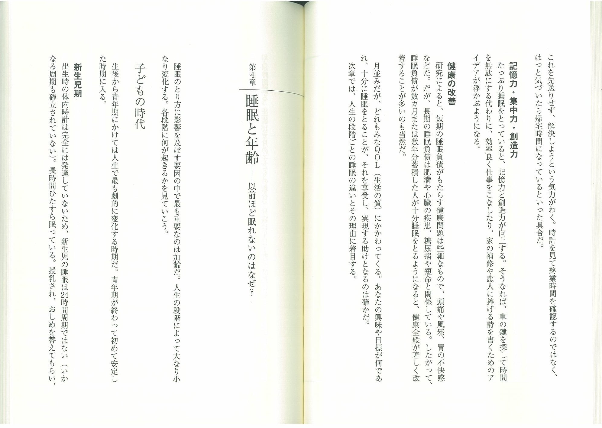 など、睡眠がもたらす健康上のメリットについて説き、さらに睡眠問題の兆候を挙げ、各種問題の解決方法について詳細にアドバイスする。