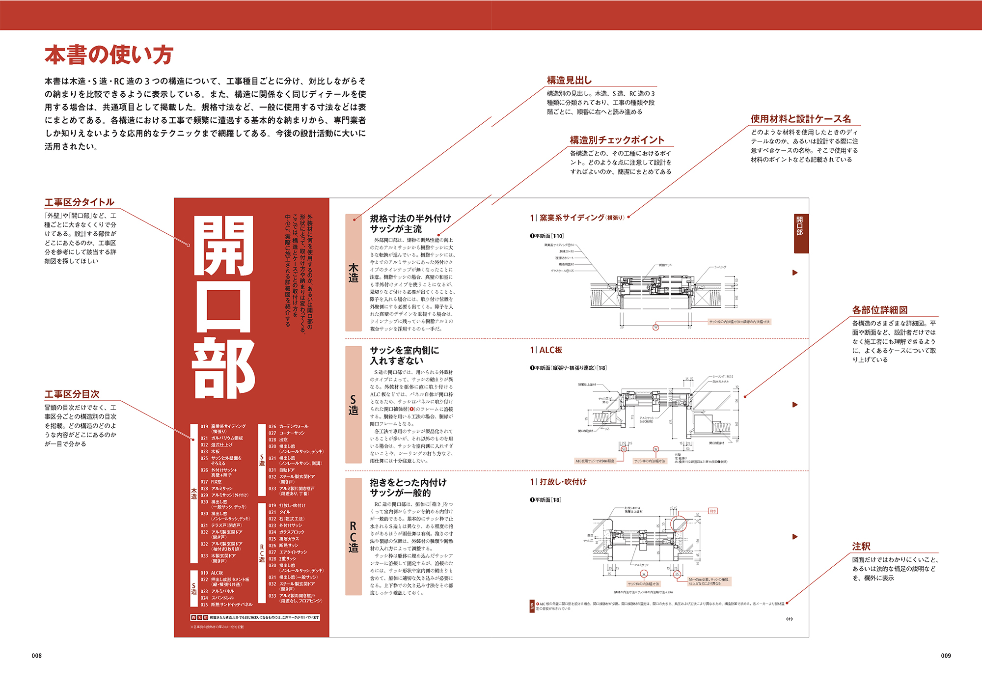 各構造における工事で頻繁に遭遇する基本的な納まりから、専門業者しか知りえないような応用テクニックまで幅広く網羅しています。
