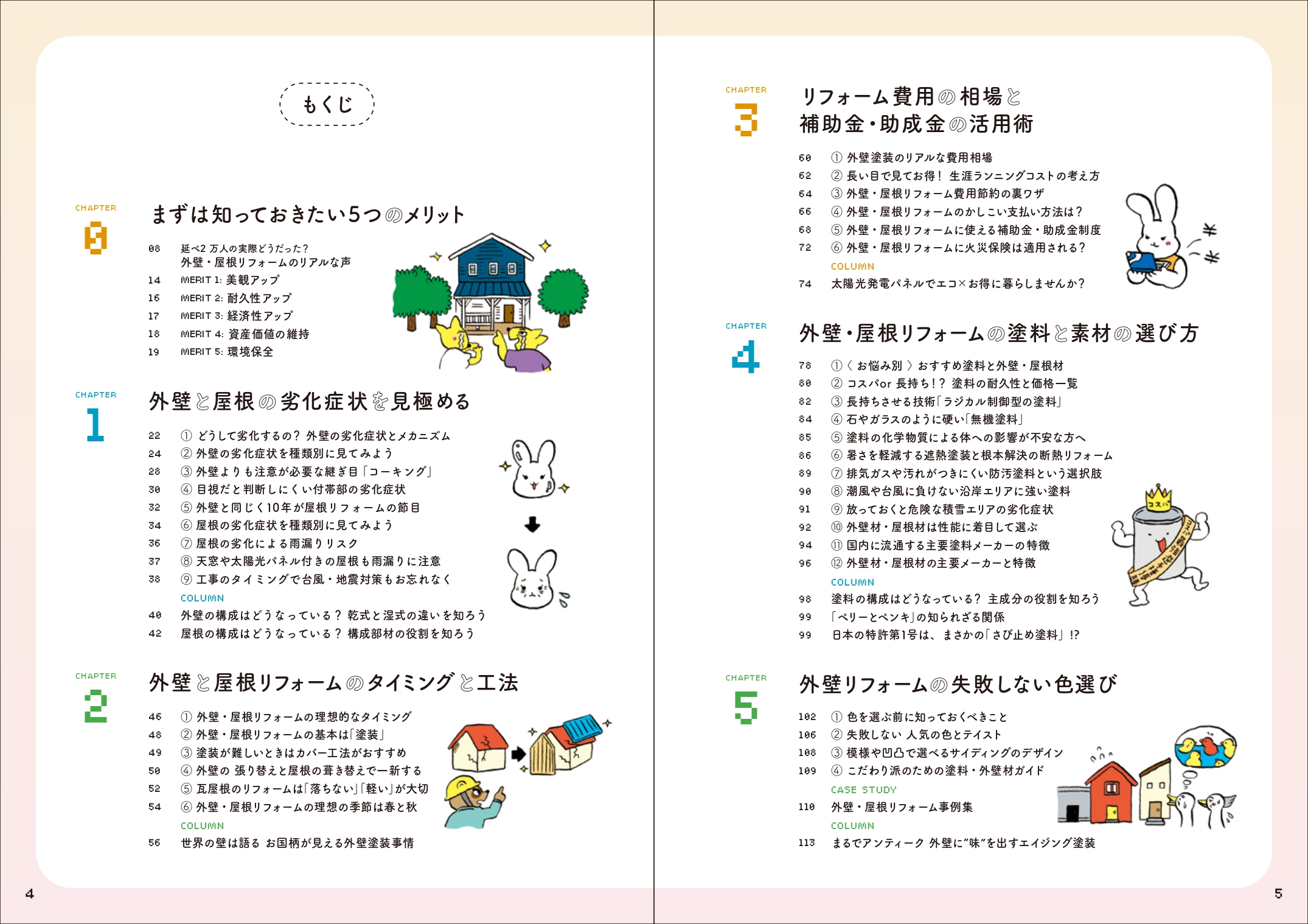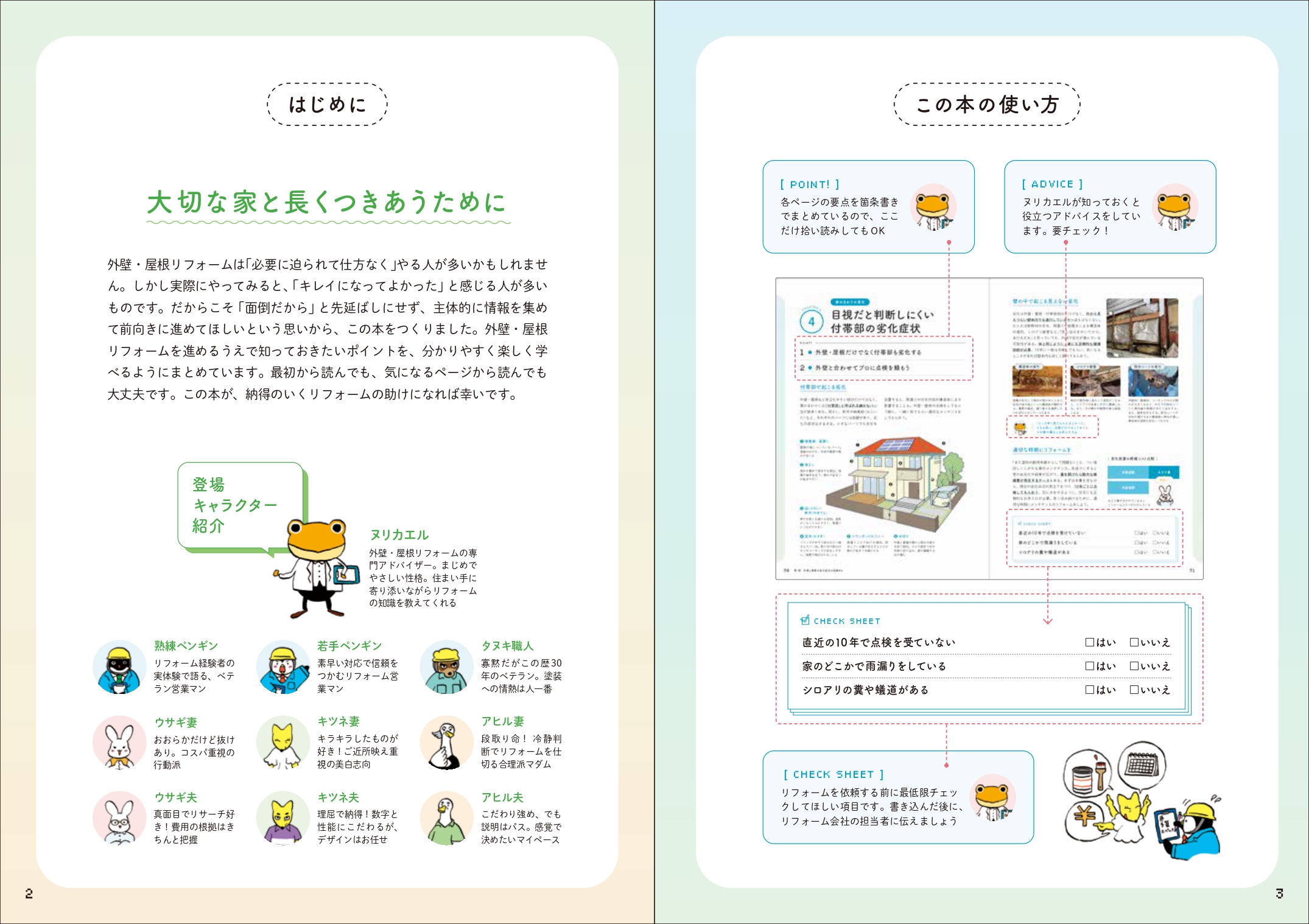 外壁・屋根リフォームの劣化症状の点検・会社探し・見積もり比較・契約・工事中・工事完了までに必要な知識を、楽しく分かりやすく学べる1冊です。大手塗料メーカーやリフォーム会社への取材をもとに、リアルな現場の知見も盛り込みました。