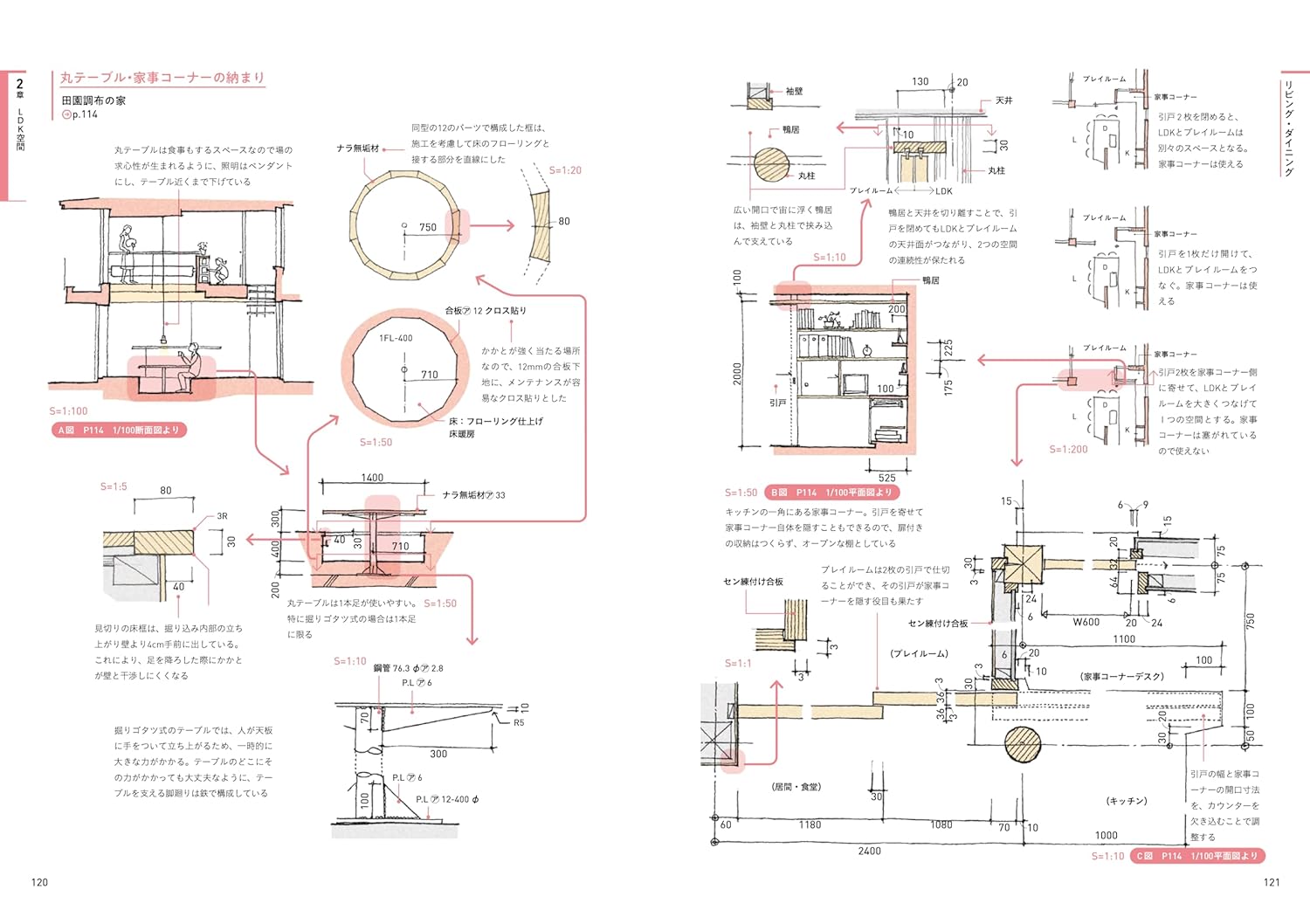 どんな住宅の、どんなプランのディテールなのかが一目でわかるよう、生活感の伝わる平面・断面図もあわせて掲載しています。